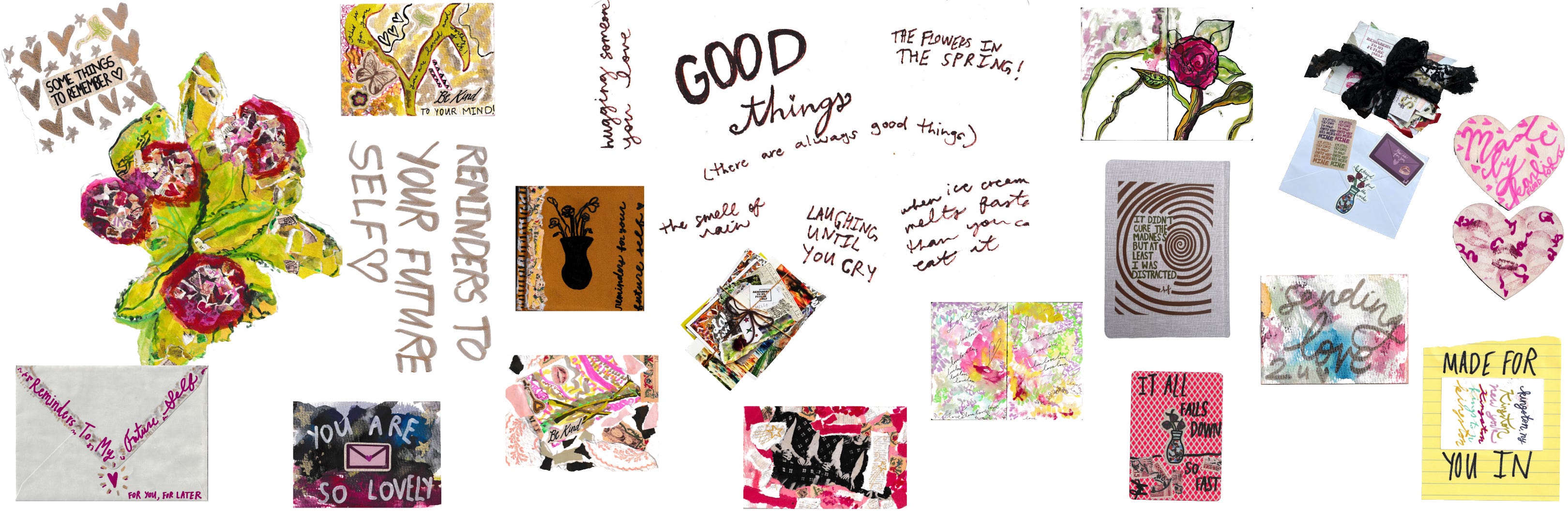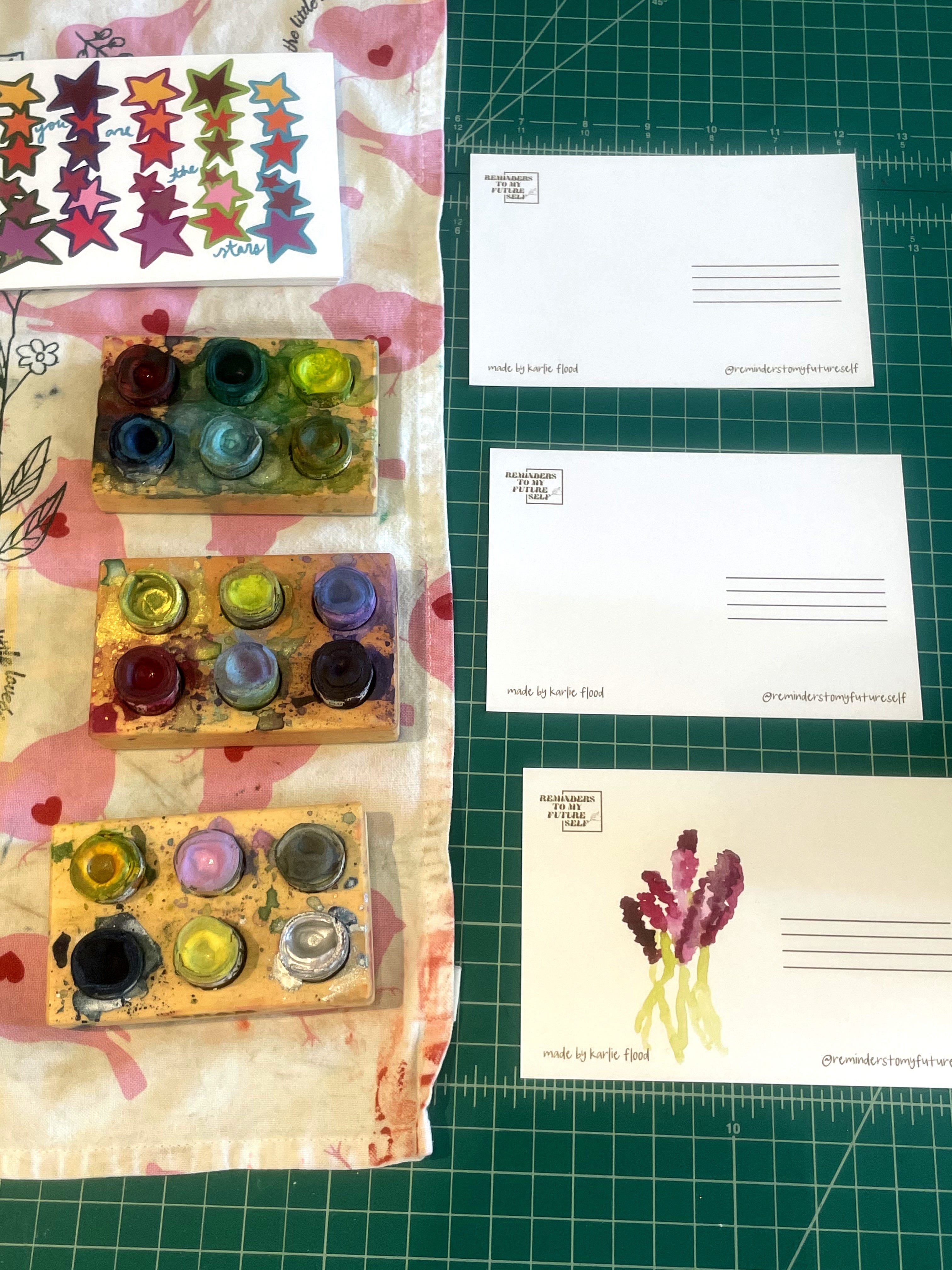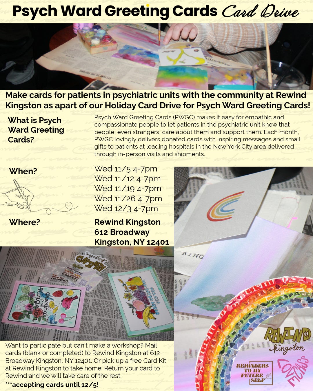 -I started a card drive for a woman I met named katherine who founded a nonprofit called psych ward greeting cards. she created this program after being in the hospital and felt like some hope, positivity, and support from kind strangers could go a long way. now she is partnered with 10 hospitals—one the hospital cass was at—sending messages of hope without waiting for the medical field to incorporate it into their programs. I think there is a lot of power and beauty in that. anyways, she didn’t have enough cards. I MAKE cards!